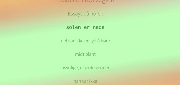 Norvégien: Essais en norvégien Essays på norsk solen er nede det var ikke en lyd å høre midt blant usynlige, ukjente venner han var ikke det minste nervös vi har...