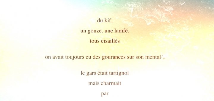 Argot : – de belles goualances – du kif,un gonze, une lamfé,tous cisaillés on avait toujours eu des gourances sur son mental’, le gars était tartignolmais charmaitpar de belles goualances sa...