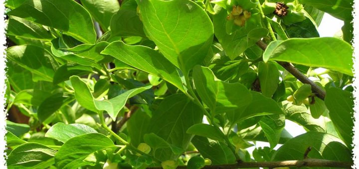 Fleurs de kaki, discrètes au milieu du beau feuillage, diospyros kaki. Plaqueminier.