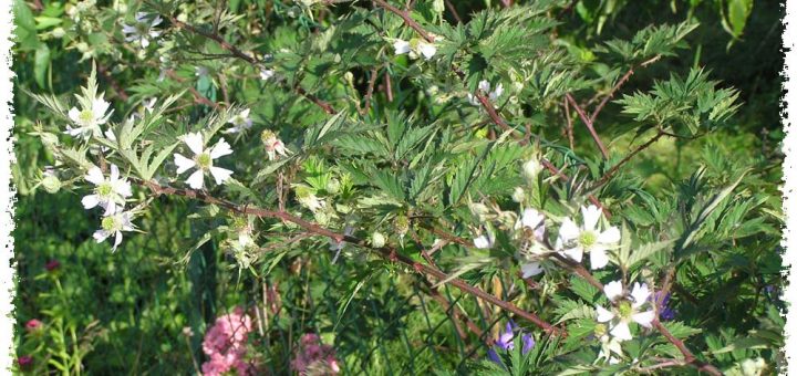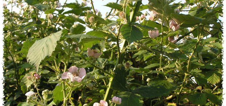Ronces: noire Theodor Reimers, Rubus fruticosus, aux belles fleurs roses.