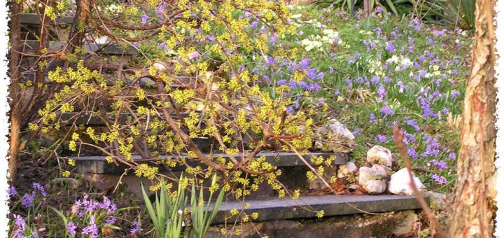 Premières fleurs de fruit au printemps, résistant au gel de printemps, délicates, jaunes et merveille à voir, celles du cornouiller à fruits comestible, cornus mas.