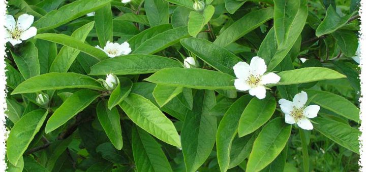 Fleurs tardives de néflier d’Allemagne au fruit brun qui se mange en décembre aux gelées, mespilus germanica.