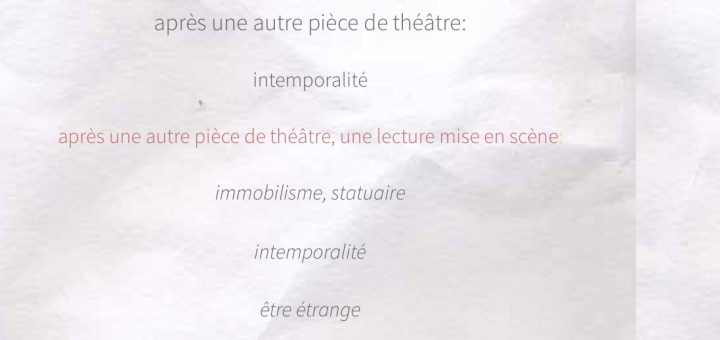 Poésie: après une autre pièce de théâtre: intemporalité après une autre pièce de théâtre, une lecture mise en scène: immobilisme, statuaire intemporalité être étrange planète BWX772 K mouvements rares intensions tendues sourire étrange qu’est-ce...