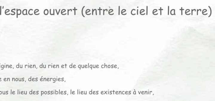 Espaces: De l’espace ouvert (entre le ciel et la terre) : de l’origine, du rien, du rien et de quelque chose, du vide en nous, des énergies, pour nous le lieu des possibles, le...