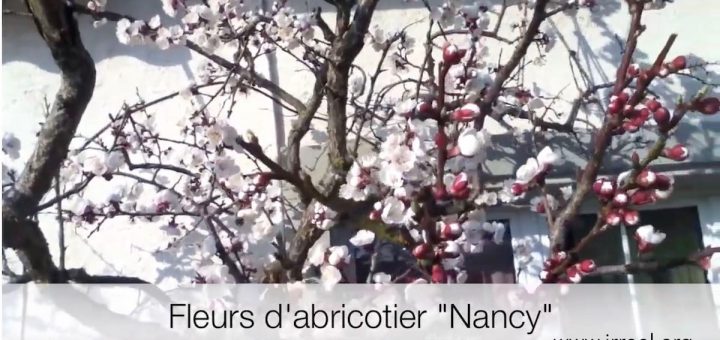 Abricot: abricotier var. Nancy, Prunus armeniaca, sud maison, fleurs blanches, fleurs colorées d’abricotier et abeilles.